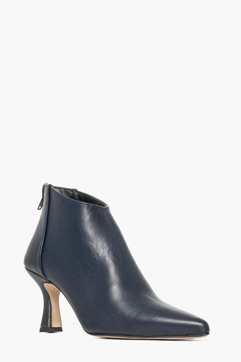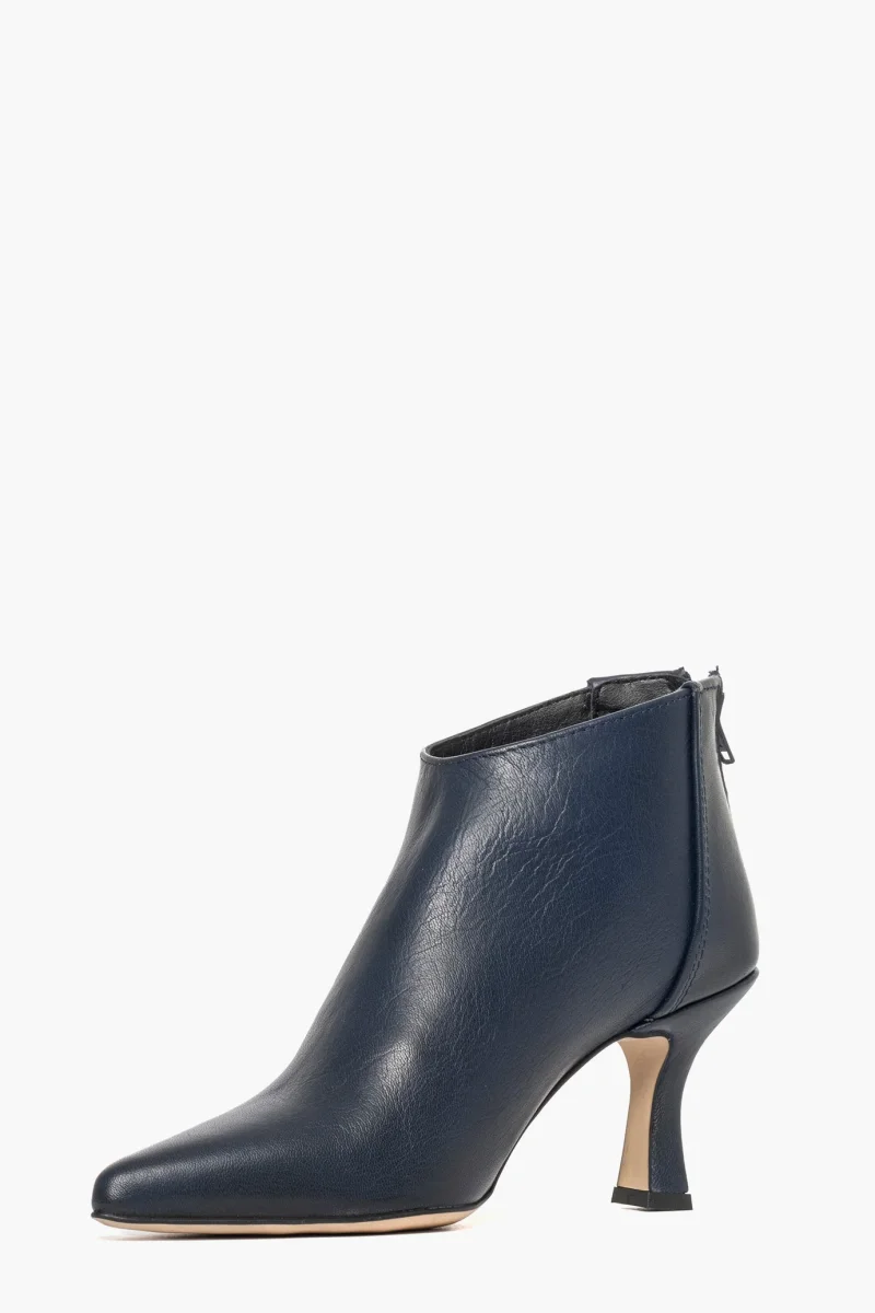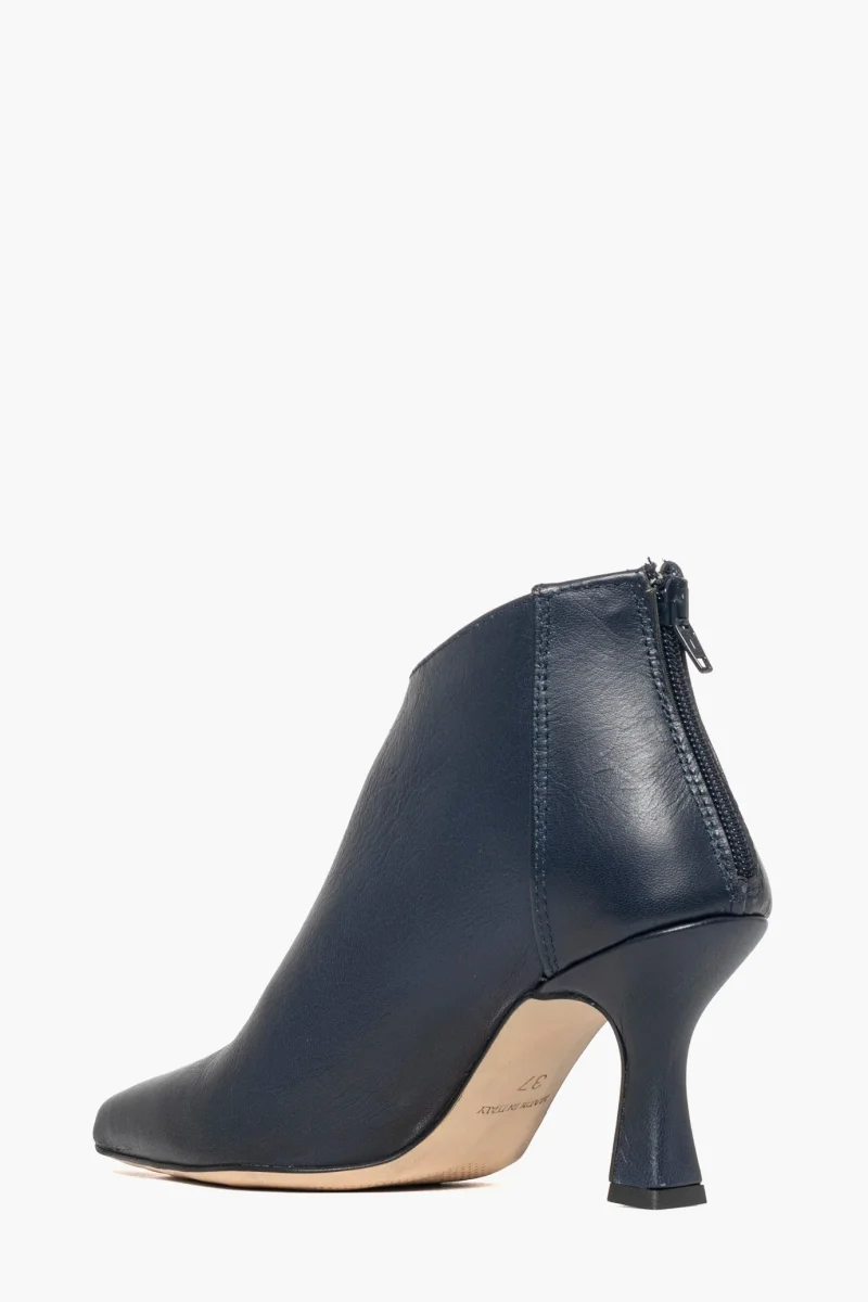 Tronchetti in pelle blu con zip, interni e sottopiede in similpelle, tacco rivestito in pelle, altezza 8 cm. Calzata regolare, punta leggermente stretta in avanti. Calzature realizzate in modo artigianale, rigorosamente Made in Italy.
