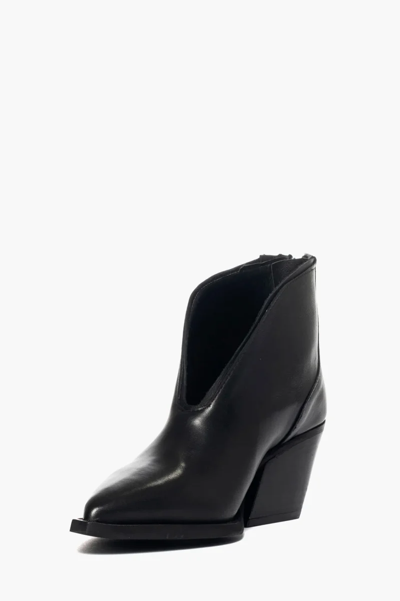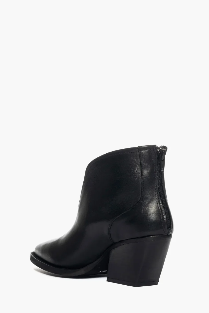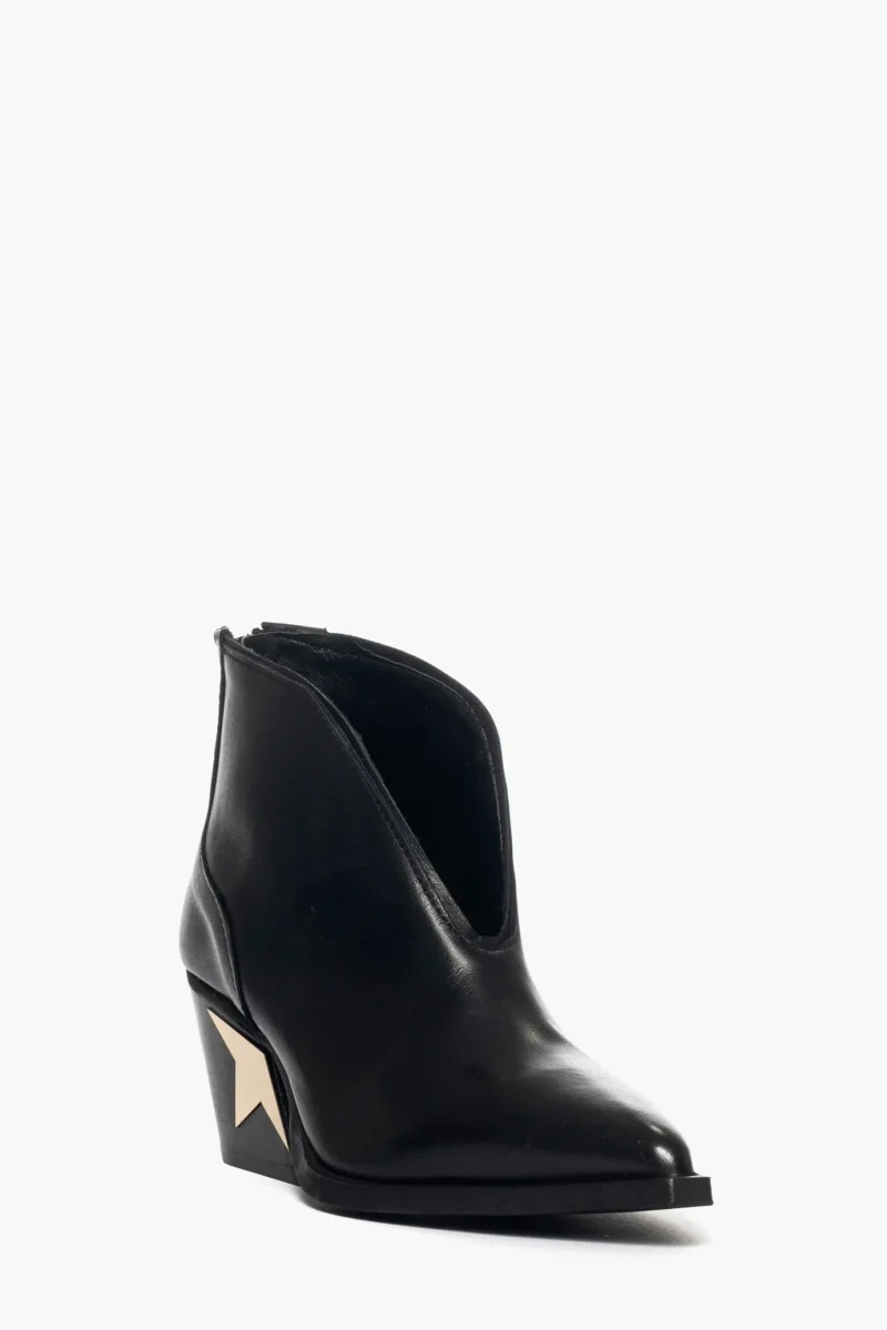 Tronchetti alla caviglia in pelle nero, con tacco 5 cm, suola nera, interni in pelle, con cerniera, applicato sul tacco una placca nel colore oro a forma di mezza stella. Calzano giuste, punta stretta.