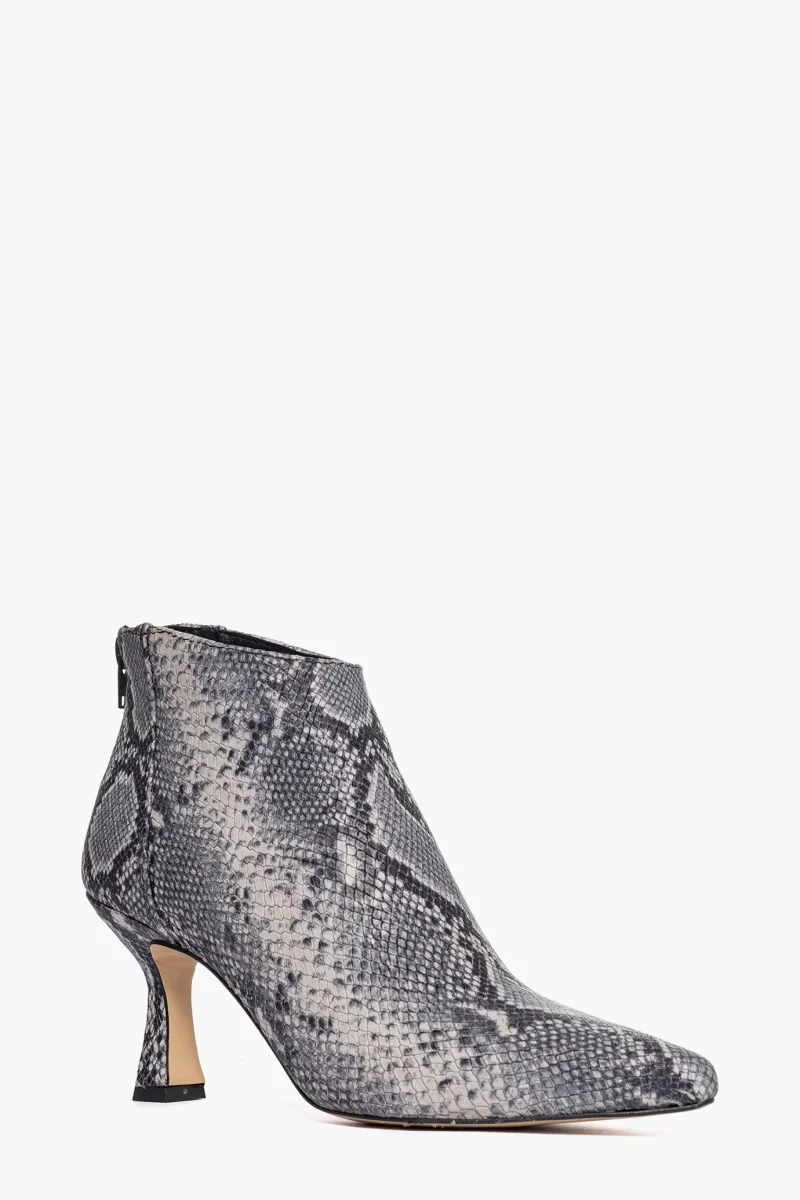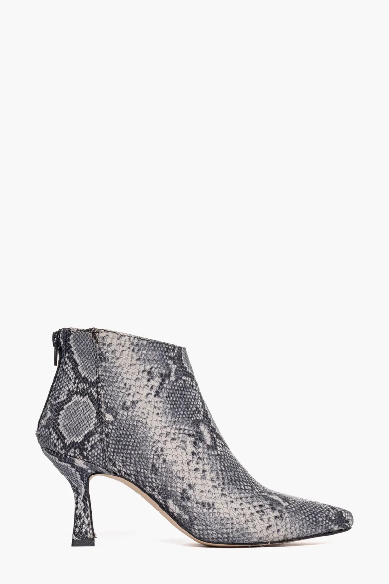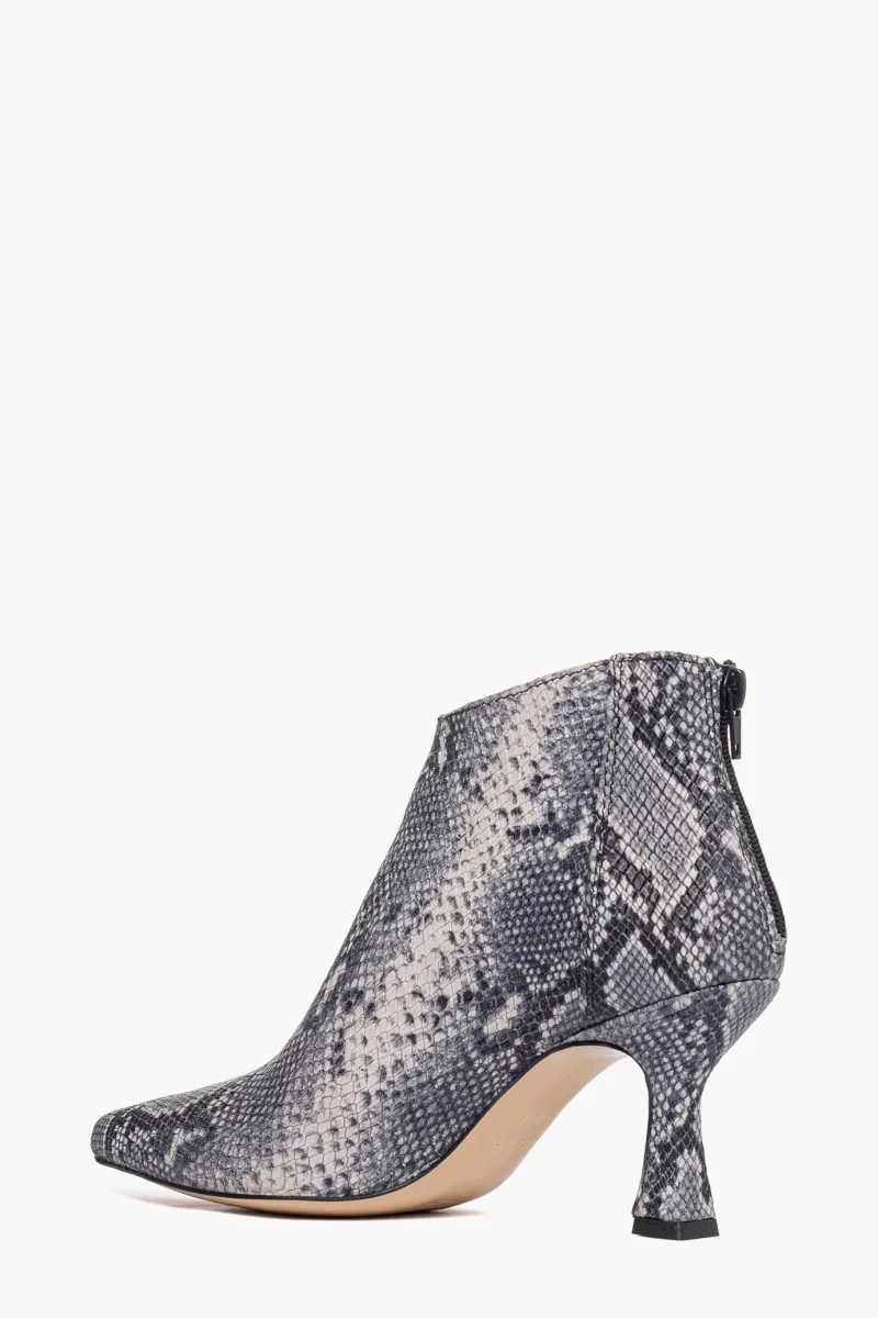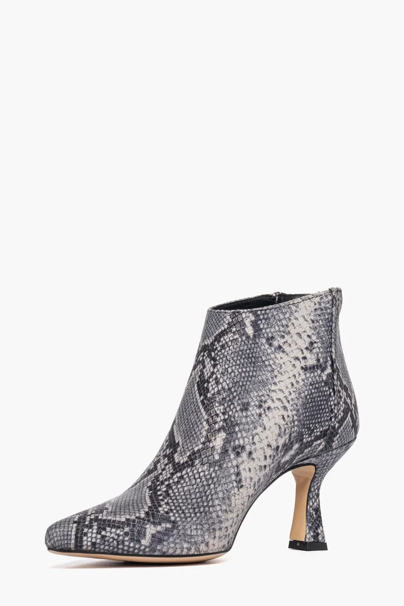 Tronchetti in pelle pitone bianco grigio, con zip, interni e sottopiede in similpelle, tacco rivestito in pelle, altezza 8 cm. Calzata regolare, punta leggermente stretta in avanti. Calzature realizzate in modo artigianale, rigorosamente Made in Italy.