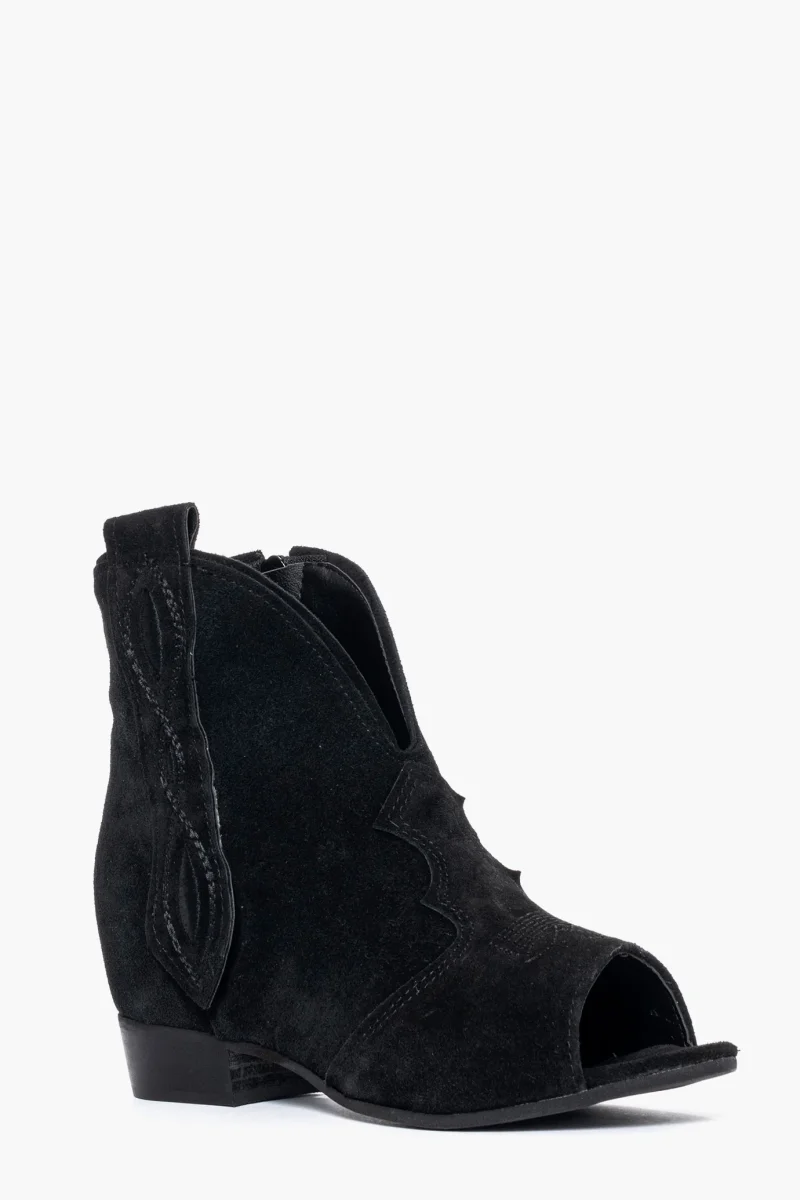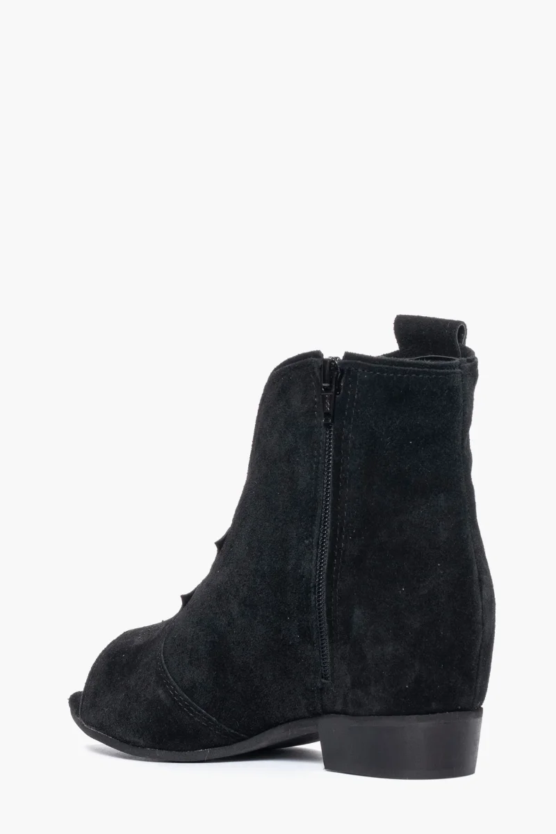 Tronchetto in camoscio nero con rialzo interno 3cm, ricami ai lati in tinta, cerniera interno piede, altezza totale 6cm, interni in similpelle, punta aperta, suola in tunit nera. Calzano regolari. Calzature artigianali, made in Italy.