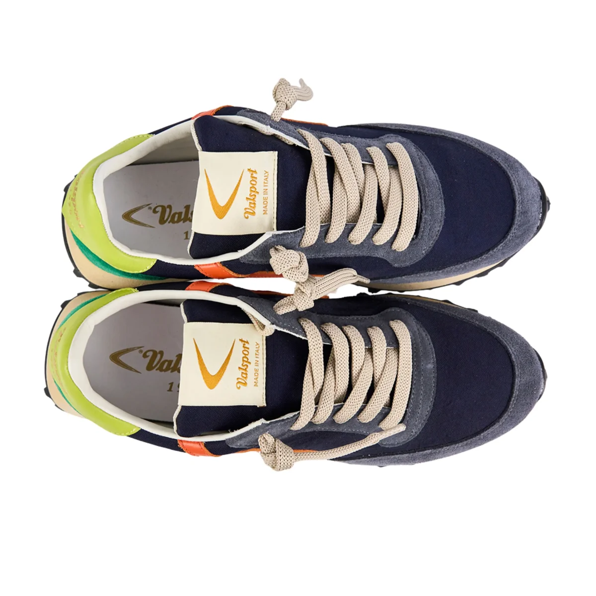 Sneaker basse Valsport modello Start Heritage, realizzate a mano in Italia con tomaia in nylon vintage e suede, fodera in pelle e lacci in cotone.