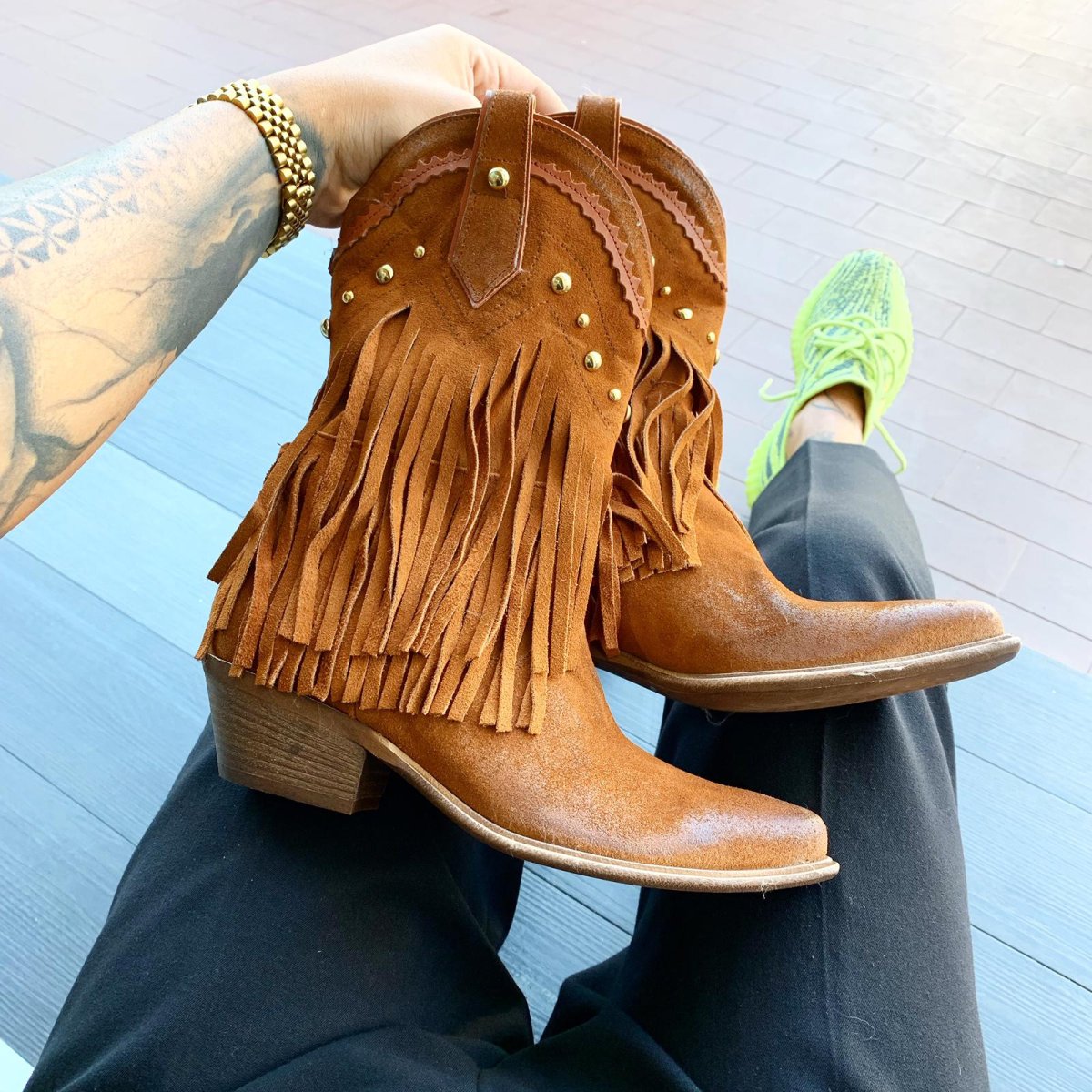 Stivali Oldwest 100 camoscio cuoio con frange e borchie