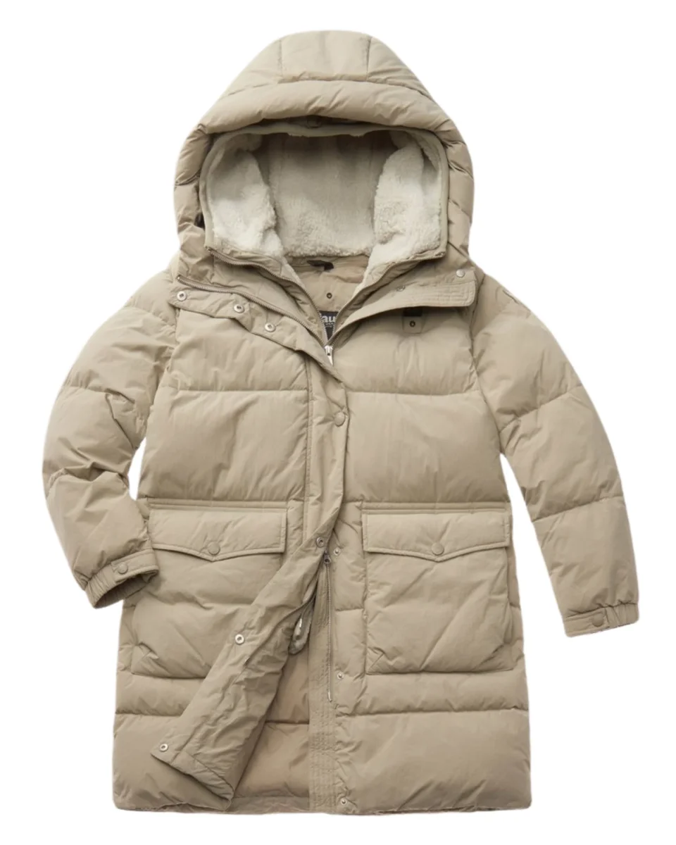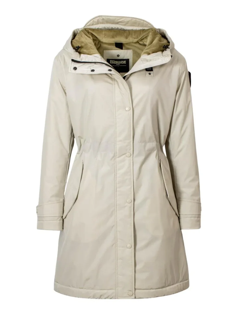 Blauer Parka lungo in nylon liscio leggero e idrorepellente con cappuccio fisso donna PAYNE beige